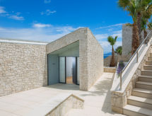 5 -sobna vila 350 m2 na 3 etaže, prema sjeveru. 1 soba s Garderoba s 1 franc. krevetom (160 cm, dužina 200 cm), tušem/WC-om i klima uređajem. Gornji kat: dnevni boravak/blagovaona 100 m2 s otvorenim kaminom i TV-om sa sat. prijemnikom (plosnatim TV ekranom), klima uređajem. Izlaz na terasu. Otvorena kuhinja (pećnica, perilica za suđe, 4 staklokeramičke ploče za kuhanje, mikrovalna pećnica, zamrzivač, el. aparat za kavu). Odv. WC. 2. Gornji kat: 1 soba s 1 franc. krevetom (160 cm, dužina 200 cm), tušem/WC-om i klima uređajem. Izlaz na terasu. 1 soba s Garderoba s 1 franc. krevetom (160 cm, dužina 200 cm), kadom/tušem/WC-om i klima uređajem. Izlaz na terasu. 1 soba s 1 krevetom (80 cm, dužina 200 cm), 1 krevetom na izvlačenje (dužina 200 cm), tušem/WC-om i klima uređajem. Izlaz na terasu. Grijanje toplim zrakom. Terasa 50 m2, terasa 45 m2. Garnitura za sjedenje, ležaljke. Prekrasan pogled na more. Na raspolaganju: sef, visoka dječja stolica, dječji krevetić, sušilo za kosu. Internet (wireless LAN [WLAN], besplatan). Dodatna informacija: kuća za nepušače. Spa zona u prizemlju uključuje: saunu, hidromasažna kada, tuš, odv. WC (sve uključeno u cijenu).- Značajke smještaja