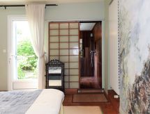 "Pavillon Asiatique", 2 -sobna kuća u nizu 47 m2. Lijepo i udobno uređena: dnevni boravak/blagovaona s 1 kaučem za 1 osobu (140 cm), švedskom peći, stolom za blagovanje, radiom, CD-om, muzičkom linijom i DVD-om. Izlaz na terasu. 1 soba s 1 franc. krevetom (140 cm, dužina 190 cm). Izlaz na terasu. Otvorena kuhinja (pećnica, perilica za suđe, 2 plamena za kuhanje, toster, kuhalo za vodu, zamrzivač). Tuš/WC. Grijanje na naftu. Parketni pod, prirodni kameni pod. 2 terase. Garnitura za sjedenje, vrtni roštilj (prijenosni), ležaljke (1). Na raspolaganju: perilica za rublje. Internet (wireless LAN [WLAN], besplatan). Dodatna informacija: kuća za nepušače. Protupožarni alarm.- postrojenja