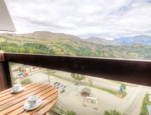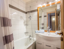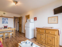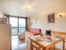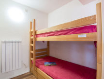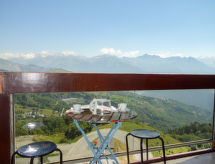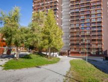 1 -sobni studio 28 m2 na 12. katu, prema sjeveru. Jednostavno i lijepo uređen: dnevni boravak/blagovaona s 1 krevetom na izvlačenje (2 osobe 2 x 80 cm, dužina 190 cm), TV-om (plosnatim TV ekranom). Izlaz na balkon, prema sjeveru. Niša za spavanje s 1 x 2 kreveta na kat (80 cm, dužina 190 cm). Mala kuhinja (2 ploče za kuhanje, mini pećnica, perilica za suđe, toster, kuhalo za vodu, mikrovalna pećnica, zamrzivač, el. aparat za kavu, Doze za mašinu za kavu (SENSEO) uz doplatu, raclette roštilj). Kada, odv. WC. El. grijanje. Parketni pod. Balkon 4 m2, prema sjeveru. Vrlo lijep pogled na planine i dolinu. Na raspolaganju: glačalo. Internet (wireless LAN [WLAN], uz doplatu). Dodatna informacija: apartman za nepušače. Najviše 1 mali kućni ljubimac / pas dozvoljen. Protupožarni alarm.- postrojenja