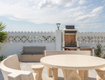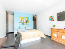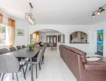 5 -sobna kuća 180 m2 na 2 etaže. Prostrano i svijetlo, komforno uređena: dnevni boravak/blagovaona s kutom za blagovanje, TV-om sa sat. prijemnikom i digitalnim TV (plosnatim TV ekranom). Izlaz na terasu, na bazen. 1 soba s 1 franc. krevetom. Otvorena kuhinja (4 ploče za kuhanje, perilica za suđe, mikrovalna pećnica, zamrzivač, el. aparat za kavu). Odv. WC. Klima uređaj. Gornji kat: 1 soba s 1 franc. krevetom (135 cm, dužina 180 cm), tušem/WC-om. Izlaz na balkon. 1 soba s 1 franc. krevetom (135 cm, dužina 190 cm). Izlaz na balkon. 1 soba s 2 kreveta (90 cm). Izlaz na balkon. 1 soba s 1 franc. krevetom (150 cm, dužina 195 cm), tušem/WC-om. Izlaz na terasu. Kada/tuš/WC. Klima uređaj. Balkon, terasa 18 m2, velika terasa 80 m2 (djelomično natkrita), vrt, travnjak. Garnitura za sjedenje, vrtni roštilj, ležaljke, lođa. Prekrasan pogled na bazen i kanal. Na raspolaganju: perilica za rublje. Internet (wireless LAN [WLAN], besplatan). Parking (ograđen) uz kuću. Dodatna informacija: privatni vez za barku. TV samo ES, FR. HUTG010161- postrojenja