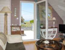 "Penn an Aod (KER225)", 4 -sobna polovica dvojne kuće 75 m2 na 2 etaže. Svijetlo, ukusno i udobno uređena: dnevni boravak/blagovaona s stolom za blagovanje, TV-om sa sat. prijemnikom, radiom, CD-om i DVD-om. Izlaz na terasu. 1 soba s kliznim vratima s 1 krevetom na izvlačenje (2 x 80 cm, dužina 190 cm). Otvorena kuhinja (pećnica, perilica za suđe, 3 Indukcione ploče, toster, kuhalo za vodu, mikrovalna pećnica, zamrzivač, el. aparat za kavu). Tuš, odv. WC, duplim umivaonikom. El. grijanje. Gornji kat: s kosim stropom, otvoreni dnevni boravak s TV-om sa sat. prijemnikom, radiom, CD-om i DVD-om. Izlaz na balkon. 1 soba s kosim stropom s 2 kreveta (80 cm, dužina 190 cm). 1 soba s kosim stropom s 1 franc. krevetom (140 cm, dužina 190 cm). Parketni pod. Balkon, prema jugozapadu, terasa 20 m2, prema jugozapadu, vrt 200 m2, travnjak. Garnitura za sjedenje, balkonski namještaj, vrtni roštilj (prijenosni), ležaljke (2), ostava. Pogled na more. Na raspolaganju: perilica za rublje, glačalo, visoka dječja stolica, dječji krevetić. Dodatna informacija: kuća za nepušače. Protupožarni alarm. Raspored kreveta je fleksibilan. Dostupno je više mogućnosti za spavanje od maksimalno dopuštenog broja osoba koji se ipak ne smije prekoračiti- postrojenja