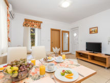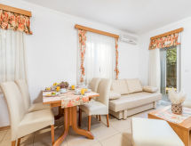 "Petra 2", 2 -sobni apartman 36 m2, u prizemlju. Moderno i udobno uređen: dnevni boravak/blagovaona 18 m2 s 1 kaučem za 2 osobe (145 cm, dužina 195 cm), TV-om sa sat. prijemnikom i klima uređajem. Izlaz na terasu. 1 soba s 1 bračnim krevetom (160 cm, dužina 200 cm). Izlaz na terasu. Otvorena kuhinja (4 ploče za kuhanje, mikrovalna pećnica, zamrzivač). Tuš/WC. Terasa 20 m2 (natkrita). Garnitura za sjedenje. Pogled na bazen. Na raspolaganju: sef. Internet (wireless LAN [WLAN], besplatan). Parking. Pristup internetu moguć samo izvan objekta, u blizini objekta IVANA.- postrojenja