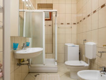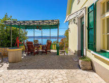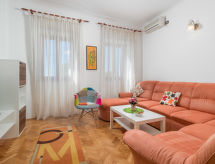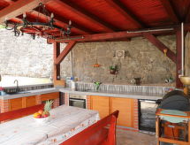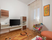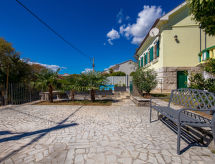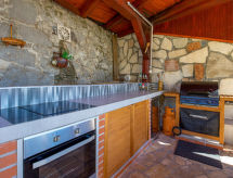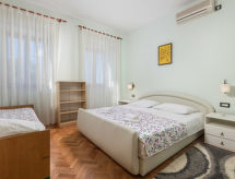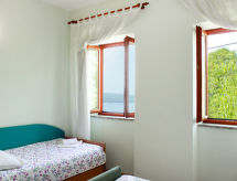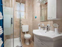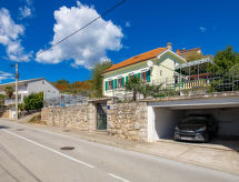 3 -sobna kuća 75 m2. Lijepo uređena: dnevno-spavaća soba s 1 kaučem za 2 osobe (160 cm, dužina 200 cm), TV-om sa sat. prijemnikom i klima uređajem. 1 soba s 1 franc. krevetom (180 cm, dužina 200 cm), klima uređajem. 1 soba s 1 krevetom (90 cm, dužina 200 cm), 1 franc. krevetom (180 cm, dužina 200 cm), klima uređajem. Kuhinja (pećnica, perilica za suđe, 4 staklokeramičke ploče za kuhanje, toster, kuhalo za vodu, zamrzivač, el. aparat za kavu) s malim stolom za blagovanje. 2 x tuš/WC. Grijanje toplim zrakom. Parketni pod. Terasa 30 m2. Garnitura za sjedenje, vrtni roštilj, ležaljke (2). Pogled na more. Na raspolaganju: perilica za rublje, glačalo, visoka dječja stolica, dječji krevetić. Internet (wireless LAN [WLAN], besplatan). Parking (natkrit, 2 automobila) uz kuću, visina 190 cm. Dodatna informacija: apartman za nepušače. Najviše 1 kućni ljubimac / pas dozvoljen.- postrojenja
