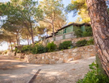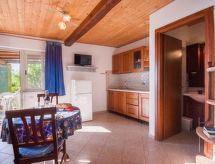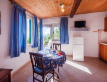 1 -sobna kuća 23 m2, u prizemlju. Svrsishodno i udobno uređena: dnevni boravak/blagovaona s zavjesom s 1 bračnim krevetom, stolom za blagovanje, međunarodnim TV kanalima i ventilatorom. Izlaz na terasu. Mala kuhinjska niša (2 plamena za kuhanje). Tuš/WC. Bez grijanja. Terasa (natkrita). Garnitura za sjedenje, ležaljke (1). Prekrasan panoramski pogled na vrt i more. Na raspolaganju: mrežice protiv komaraca, dječji krevetić do 2 godine, sušilo za kosu. Parking (1 automobil). Dodatna informacija: apartman za nepušače. Najviše 1 kućni ljubimac / pas dozvoljen.- postrojenja