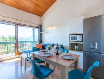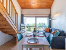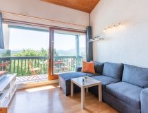 "Plein soleil", 2 -sobni apartman 37 m2, u prizemlju. Svrsishodno i komforno uređen: dnevni boravak/blagovaona s TV-om (plosnatim TV ekranom). 1 otvorena soba s kosim stropom s 1 bračnim krevetom (1 x 140 cm, dužina 190 cm). 1 soba s 1 bračnim krevetom (1 x 140 cm, dužina 190 cm). Mala kuhinjska niša 3 m2 (pećnica, perilica za suđe, toster, kuhalo za vodu, mikrovalna pećnica, el. aparat za kavu). Kada, kada/WC. Grijanje na plin. Mali balkon 3 m2, mali balkon 2 m2. Lijep pogled na planine i bazen. Na raspolaganju: perilica za rublje, glačalo, sušilo za kosu. Internet (wireless LAN [WLAN], besplatan). Parking. Dodatna informacija: apartman za nepušače. Protupožarni alarm. 6448300205508- Značajke smještaja
