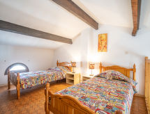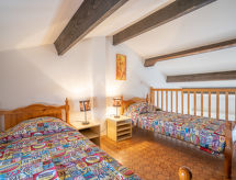 2 -sobni apartman 35 m2 na 2 etaže na 2. katu. Svrsishodno uređen: dnevni boravak/blagovaona s TV-om (plosnatim TV ekranom). Izlaz na lođu. 1 mala soba s 1 franc. krevetom (140 cm, dužina 190 cm). Kuhinjska niša (4 ploče za kuhanje, mini pećnica, mikrovalna pećnica, zamrzivač, el. aparat za kavu). Tuš, odv. WC. Gornji kat: (strme stepenice) s kosim stropom galerija s 2 kreveta (90 cm, dužina 190 cm). Lođa. Pogled na lagunu. Na raspolaganju: perilica za rublje. Internet (wireless LAN [WLAN], uz doplatu). Parking. Dodatna informacija: protupožarni alarm.- Značajke smještaja