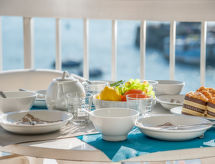 3 -sobni apartman 68 m2 na 4. katu. Komforno uređen: dnevni boravak/blagovaona s 1 kaučem za 1 osobu (140 cm, dužina 160 cm), TV-om (plosnatim TV ekranom). Izlaz na terasu. 1 soba s 1 franc. krevetom (1 x 140 cm, dužina 190 cm). 1 soba s 2 kreveta (90 cm, dužina 190 cm). Kuhinja (4 ploče za kuhanje, pećnica, mikrovalna pećnica). Tuš, odv. WC. El. grijanje. Velika terasa 11 m2. Garnitura za sjedenje. Lijep pogled na more. Na raspolaganju: perilica za rublje. Internet (wireless LAN [WLAN], uz doplatu). Parking br. 59. Dodatna informacija: protupožarni alarm.- Značajke smještaja