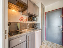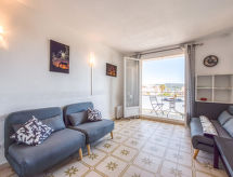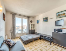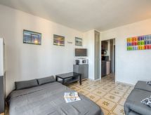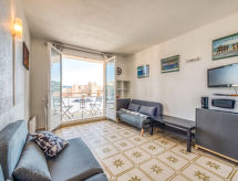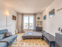1 -sobni studio 20 m2 na 3. katu, prema jugu. Objekt pogodan za 2 odraslih + 1 dijete. Komforno i lijepo uređen: dnevni boravak s 2 kauča za 1 osobu (90 cm, dužina 190 cm), 1 kaučem za 2 osobe (125 cm, dužina 190 cm), TV-om (plosnatim TV ekranom), ventilatorom. Izlaz na balkon. Kuhinjska niša u predsoblju (mini pećnica, 2 staklokeramičke ploče za kuhanje, toster, kuhalo za vodu, mikrovalna pećnica, el. aparat za kavu, Doze za mašinu za kavu (Senseo) uz doplatu). Kada/WC. El. grijanje. Balkon 6 m2. Balkonski namještaj. Pogled u daljini na more i luku. Na raspolaganju: glačalo, sušilo za kosu. Internet (wireless LAN [WLAN], uz doplatu). Dodatna informacija: apartman prema parkingu. Bez parkinga. 1 mali kućni ljubimac / pas dozvoljen. TV samo FR. Protupožarni alarm.- Značajke smještaja