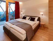 "Appartement Comfort (SML550)", 2 -sobni apartman 45 m2. Svijetlo, moderno i ukusno uređen: dnevno-spavaća soba s 1 kaučem za 2 osobe, stolom za blagovanje, TV-om sa sat. prijemnikom i radiom. Izlaz na balkon. 1 soba s 1 bračnim krevetom. Izlaz na balkon. Otvorena kuhinja (pećnica, perilica za suđe, 4 staklokeramičke ploče za kuhanje). Kada ili tuš/WC. Podno grijanje. Parketni pod. Balkon. Balkonski namještaj. Prekrasan panoramski pogled na planine i krajolik. Na raspolaganju: telefon, visoka dječja stolica, dječji krevetić (uz doplatu), sušilo za kosu. Internet (wireless LAN [WLAN], besplatan). Dodatna informacija: prikladno za obitelji. Apartman za nepušače. Protupožarni alarm.- Značajke smještaja