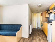"Prinsenhof", 3 -sobna mobilna kućica 27 m2. Jednostavno uređena: otvoreni dnevni boravak/blagovaona s kutom za blagovanje i TV-om. Izlaz na terasu. 1 soba s 1 bračnim krevetom. 1 soba s 2 kreveta. Otvorena kuhinja (4 ploče za kuhanje, kuhalo za vodu, mikrovalna pećnica, el. aparat za kavu). Tuš/WC. Grijanje. Terasa. Garnitura za sjedenje. Parking uz kuću. Dodatna informacija: hladnjak bez zamrzivača. Najviše 2 kućna ljubimca / psa dozvoljena.
