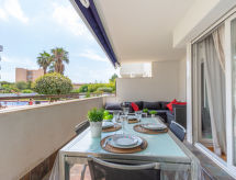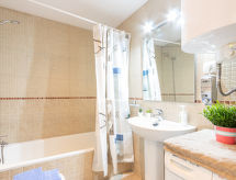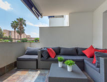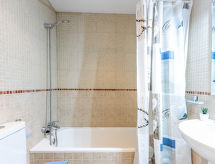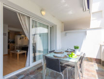 2 -sobni apartman 45 m2. Svijetlo, lijepo i moderno uređen: dnevni boravak s 1 kaučem za 2 osobe, TV-om, TV-om sa sat. prijemnikom, digitalnim TV, klima uređajem i grijanjem na topli zrak. Izlaz na terasu, prema jugu i prema istoku. 1 soba s 1 franc. krevetom (150 cm, dužina 190 cm), TV-om. (perilica za suđe, 4 staklokeramičke ploče za kuhanje, toster, mikrovalna pećnica, zamrzivač, el. aparat za kavu). Kada/WC. Velika terasa 16 m2. Garnitura za sjedenje, mjesto za sjedenje. Lijep pogled na bazen i vrt. Na raspolaganju: perilica za rublje, glačalo, visoka dječja stolica, dječji krevetić, sušilo za kosu. Garaža br. 113. Dodatna informacija: apartman za nepušače. TV samo FR, ES. HUTG039975- postrojenja