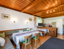 6 -sobni apartman 120 m2 na 1. katu. Ukusno uređen: predsoblje. 1 bračna soba. 1 bračna soba s umivaonikom. 1 soba s 2 kreveta i umivaonikom. 1 soba s 3 kreveta i umivaonikom. Kuhinja/dn. boravak (4 ploče za kuhanje, pećnica, perilica za suđe) s 1 kaučem za 2 osobe, kutom za blagovanje i TV-om sa sat. prijemnikom. 2 x tuš, 2 x odv. WC. Balkon. Prekrasan panoramski pogled na jezero, planine i krajolik. Na raspolaganju: visoka dječja stolica, dječji krevetić. Internet (wireless LAN [WLAN], besplatan). Dodatna informacija: prikladno za obitelji. Apartman za nepušače. Najviše 1 kućni ljubimac / pas dozvoljen. Protupožarni alarm. 50628-000205-2020- postrojenja