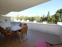 "Residencial Mar I", 3 -sobni apartman 53 m2. Lijepo uređen: dnevni boravak/blagovaona s digitalnim TV i plosnatim TV ekranom. Izlaz na balkon. 1 soba s 1 franc. krevetom (1 x 150 cm, dužina 200 cm), tušem/WC-om. 1 soba s 1 bračnim krevetom (1 x 135 cm, dužina 190 cm). Otvorena kuhinja (4 staklokeramičke ploče za kuhanje, mikrovalna pećnica, zamrzivač, el. aparat za kavu). Tuš/WC. Veliki balkon. Bočni pogled na more. Na raspolaganju: perilica za rublje, glačalo, visoka dječja stolica, dječji krevetić do 2 godine (uz doplatu), sušilo za kosu. Internet (wireless LAN [WLAN]). Parking br. 33. HUTTE061096- postrojenja