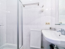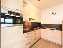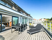 "Appartement 103", 3 -sobni apartman 87 m2 na 1. katu. Komforno uređen: dnevni boravak/blagovaona s stolom za blagovanje, TV-om sa sat. prijemnikom, DVD-om i el. grijanjem. Izlaz na terasu. 1 bračna soba s 2 kreveta. 1 bračna soba s 2 kreveta. Kuhinja (pećnica, perilica za suđe, 4 staklokeramičke ploče za kuhanje, kuhalo za vodu, mikrovalna pećnica, el. aparat za kavu). Kada/tuš/WC, duplim umivaonikom. Velika terasa 30 m2. Garnitura za sjedenje, ležaljke. Na raspolaganju: perilica za rublje, sušilica. Internet (wireless LAN [WLAN], besplatan). Garaža br. 32. Dodatna informacija: apartman prema cesti. Kuća za nepušače.- Značajke smještaja