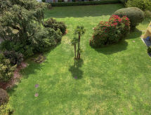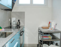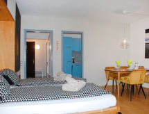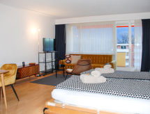 "App 601", 1 -sobni apartman 50 m2 na 6. katu, prema jugozapadu. Prostrano i svijetlo, djelomično renoviran godine 2021, komforno i moderno uređen: otvorena velika dnevno-spavaća soba s 2 rasklopna ormar-kreveta za 1 osobu (90 cm, dužina 190 cm), stolom za blagovanje, kabelskom TV, međunarodnim TV kanalima, plosnatim TV ekranom, radiom, CD-om i muzičkom linijom. Izlaz na balkon. Kuhinja (pećnica, perilica za suđe, 4 staklokeramičke ploče za kuhanje, toster, kuhalo za vodu, el. aparat za kavu, Doze za mašinu za kavu (Nespresso) uz doplatu). Kada/WC. Grijanje. Balkon. Balkonski namještaj, ležaljke (2). Bočni pogled na jezero, planine, vrt, krajolik i mjesto. Na raspolaganju: glačalo, sušilo za kosu. Internet (wireless LAN [WLAN], besplatan). Dodatna informacija: apartman za nepušače.- postrojenja