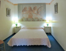 "Ribieral (GDM102)", 2 -sobni apartman 50 m2. Svrsishodno i komforno uređen: dnevni boravak/blagovaona s stolom za blagovanje i TV-om sa sat. prijemnikom (plosnatim TV ekranom), CD-om, muzičkom linijom i DVD-om. Izlaz na terasu. 1 otvorena soba, bez prozora s 1 franc. krevetom (160 cm, dužina 200 cm). Otvorena kuhinja (2 ploče za kuhanje, mini pećnica, perilica za suđe, toster, kuhalo za vodu, mikrovalna pećnica, el. aparat za kavu). Tuš, odv. WC, duplim umivaonikom. El. grijanje. Terasa 20 m2. Garnitura za sjedenje. Pogled na vrt. Na raspolaganju: Internet (DSL/LAN, besplatan). Dodatna informacija: apartman za nepušače. Protupožarni alarm.- postrojenja
