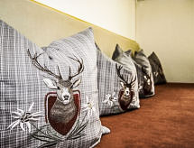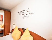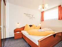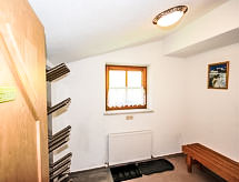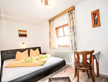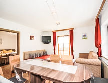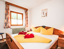 5 -sobni apartman 115 m2 na 1. katu. Udobno uređen: predsoblje. 3 bračne sobe. Dnevni boravak/blagovaona s 1 kaučem za 1 osobu, kutom za blagovanje i TV-om sa sat. prijemnikom (plosnatim TV ekranom). Izlaz na balkon. Otvorena kuhinja (pećnica, perilica za suđe, 4 staklokeramičke ploče za kuhanje, mikrovalna pećnica, el. aparat za kavu). Tuš, odv. WC, duplim umivaonikom. Donji kat: 1 bračna soba s tušem/WC-om i TV-om sa sat. prijemnikom. Balkon. Balkonski namještaj, ostava. Prekrasan pogled na planine i krajolik. Na raspolaganju: Internet (wireless LAN [WLAN], besplatan). Dodatna informacija: apartman za nepušače.- postrojenja