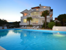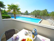2 -sobni apartman 24 m2, u povišenom prizemlju, prema jugu. Dnevni boravak/blagovaona s TV-om sa sat. prijemnikom (plosnatim TV ekranom), klima uređajem. Izlaz na terasu. 1 soba s 1 krevetom (90 cm, dužina 190 cm), 1 franc. krevetom (160 cm, dužina 200 cm). Otvorena kuhinja (4 ploče za kuhanje). Tuš/WC. Klima uređaj, grijanje toplim zrakom (uz doplatu). Terasa 7 m2 (natkrita). Garnitura za sjedenje. Pogled na bazen. Na raspolaganju: Internet (wireless LAN [WLAN], besplatan).- postrojenja