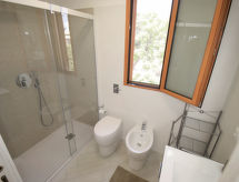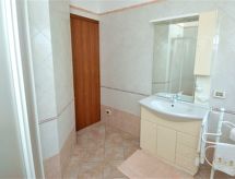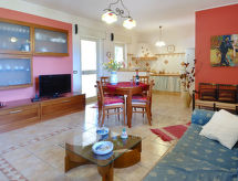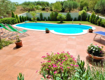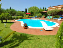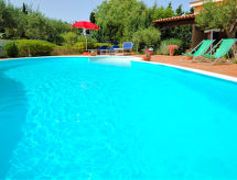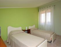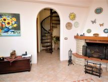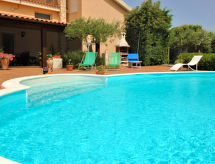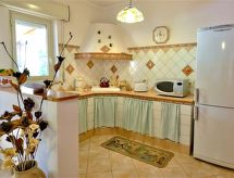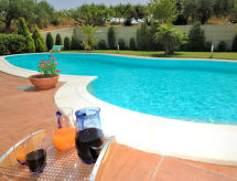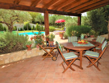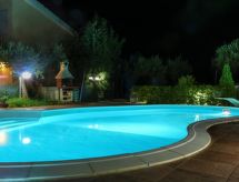 5 -sobna vila 160 m2 na 2 etaže. Komforno i ukusno uređena: dnevni boravak/blagovaona s TV-om (plosnatim TV ekranom). Izlaz na verandu, na bazen. 2 bračne sobe, svaka soba s klima uređajem i grijanjem na topli zrak. Kuhinjska niša (4 ploče za kuhanje, pećnica, toster, kuhalo za vodu, mikrovalna pećnica, zamrzivač). Tuš/bidet/WC. Gornji kat: (kružne stepenice) 1 soba s 2 kreveta, klima uređajem i grijanjem na topli zrak. 1 soba s 1 krevetom, klima uređajem i grijanjem na topli zrak. Tuš/bidet/WC. Veliki balkon 12 m2, velika vrtna terasa 20 m2 (natkrita). Garnitura za sjedenje, vrtni roštilj, ležaljke. Pogled na bazen i mjesto. Na raspolaganju: perilica za rublje, glačalo, visoka dječja stolica, dječji krevetić do 2 godine (uz doplatu), sušilo za kosu. Internet (wireless LAN [WLAN], besplatan). Parking (3 automobila). Dodatna informacija: kuća za nepušače. Najviše 1 kućni ljubimac / pas dozvoljen.- postrojenja