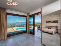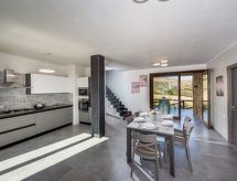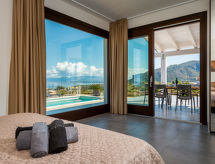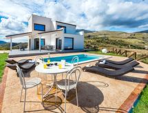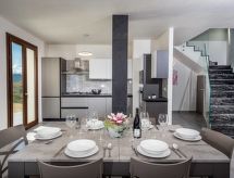 5 -sobna vila 170 m2 na 2 etaže. Moderno i ukusno uređena: veliki dnevni boravak/blagovaona s panoramskim prozorom s TV-om (plosnatim TV ekranom). Izlaz na terasu. 1 bračna soba s panoramskim prozorom s tušem/bidetom/WC-om. Izlaz na terasu. Kuhinjska niša (5 perilica za suđe, toster, kuhalo za vodu, mikrovalna pećnica, zamrzivač). Tuš/bidet/WC. Gornji kat: 1 bračna soba s tušem/bidetom/WC-om i TV-om (plosnatim TV ekranom). Izlaz na terasu. 2 bračne sobe. Tuš/bidet/WC. Klima uređaj, grijanje toplim zrakom. 2 velike terase 30 m2 (natkrite), prema sjeveroistoku terasa 15 m2, prema sjeveroistoku. Garnitura za sjedenje, vrtni roštilj, ležaljke. Vrlo lijep panoramski pogled na more, planine i bazen. Na raspolaganju: perilica za rublje, glačalo, visoka dječja stolica, dječji krevetić do 2 godine, sušilo za kosu. Internet (wireless LAN [WLAN], besplatan). Parking (3 automobila).- postrojenja
