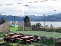 "Rorbu (FJS555)", 5 -sobna kuća 112 m2 na 2 etaže. Lijepo i ukusno uređena: dnevni boravak s zimskim vrtom. 2 sobe, svaka soba s 1 krevetom (90 cm, dužina 200 cm). Kuhinja (pećnica, perilica za suđe, 4 staklokeramičke ploče za kuhanje, toster, kuhalo za vodu, mikrovalna pećnica, zamrzivač, el. aparat za kavu) s stolom za blagovanje. Tuš/WC. Gornji kat: dnevni boravak s švedskom peći, TV-om sa sat. prijemnikom, međunarodnim TV kanalima i DVD-om. 2 sobe, svaka soba s 2 kreveta (90 cm, dužina 200 cm). Odv. WC. El. grijanje, podno grijanje. Parketni pod. Terasa 30 m2 (djelomično natkrita). Garnitura za sjedenje, vrtni roštilj. Pogled na rijeku. Na raspolaganju: perilica za rublje. Internet (wireless LAN [WLAN], uz doplatu). Dodatna informacija: najviše 1 kućni ljubimac / pas dozvoljen. Protupožarni alarm, vatrogasni aparat.- postrojenja