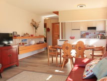"Rose des Vents 4", 4 -sobni apartman 90 m2, u prizemlju, prema jugu. Prostrano, komforno i lijepo uređen: dnevni boravak/blagovaona s otvorenim kaminom (samo za dekoraciju), stolom za blagovanje i TV-om (plosnatim TV ekranom). Izlaz u vrt, na terasu, prema jugu. 1 bračna soba s 1 bračnim krevetom (1 x 180 cm), otvorenim kaminom (samo za dekoraciju), kadom/WC-om. 1 soba s 2 kreveta (90 cm). 1 soba s 2 kreveta (90 cm). Izlaz na terasu, prema istoku. Otvorena kuhinja (pećnica, perilica za suđe, 4 staklokeramičke ploče za kuhanje, mikrovalna pećnica, zamrzivač, el. aparat za kavu, Doze za mašinu za kavu (Nespresso) uz doplatu). Kada/WC. Velika terasa, prema jugu, mala terasa, prema istoku. Garnitura za sjedenje. Vrlo lijep pogled na planine. Na raspolaganju: Internet (wireless LAN [WLAN], besplatan). Garaža br. 3. Dodatna informacija: apartman za nepušače.- postrojenja