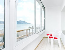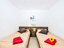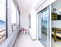 2 -sobni apartman 42 m2 na 5. katu. Svrsishodno i rustikalno uređen: otvorena dnevno-spavaća soba s zavjesom s 2 kreveta (90 cm, dužina 190 cm). Izlaz na verandu. 1 soba s 2 kreveta (90 cm, dužina 190 cm). Otvorena kuhinja (pećnica, 4 staklokeramičke ploče za kuhanje, mikrovalna pećnica). Tuš/WC. Bez grijanja. Terasa 10 m2. Balkonski namještaj. Bočni pogled na more. Na raspolaganju: Internet (wireless LAN [WLAN], besplatan). Dodatna informacija: hladnjak bez zamrzivača. TV samo DE, FR. HUTG006594- Značajke smještaja