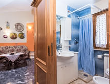 4 -sobna vila 100 m2, u povišenom prizemlju. Komforno i s puno drva uređena: otvoreni veliki dnevni boravak/blagovaona 30 m2 s 1 kaučem za 2 osobe, stolom za blagovanje, digitalnim TV i plosnatim TV ekranom. Izlaz na balkon. 2 bračne sobe. 1 soba s 1 x 2 kreveta na kat. Kuhinja (5 pećnica, perilica za suđe, mikrovalna pećnica, el. aparat za kavu) s stolom za blagovanje, digitalnim TV. Izlaz na balkon. Tuš/bidet/WC, kada/tuš/bidet/WC. Grijanje, klima uređaj. Balkon. Ležaljke (8). Pogled na bazen i vrt. Na raspolaganju: perilica za rublje, glačalo, dječji krevetić (uz doplatu). Internet (wireless LAN [WLAN], besplatan). Parking (ograđen). Prikladno za obitelji. Najviše 3 kućna ljubimca / psa dozvoljena.- postrojenja