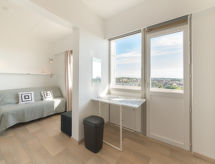 "Sea & Serenity", 1 -sobni studio 18 m2 na 6. katu. Objekt pogodan za 2 odraslih. Renoviran godine 2020, svrsishodno i moderno uređen: Studio s 1 kaučem za 2 osobe (140 cm, dužina 200 cm), digitalnim TV i plosnatim TV ekranom. Mala, otvorena kuhinja (2 Indukcione ploče, toster, kuhalo za vodu, mikrovalna pećnica, el. aparat za kavu). Tuš/WC. El. grijanje. Mala terasa. Garnitura za sjedenje. Lijep panoramski pogled na krajolik. Na raspolaganju: Internet (wireless LAN [WLAN], besplatan). Dodatna informacija: kuća za nepušače. Protupožarni alarm, vatrogasni aparat.- postrojenja