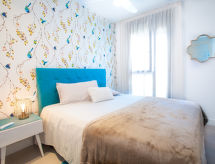 "Sealine", 3 -sobna vila 85 m2 na 1. katu, prema jugu. Svijetlo, komforno i moderno uređena: dnevni boravak/blagovaona s 1 kaučem za 2 osobe (1 x 150 cm, dužina 90 cm), klima uređajem. Izlaz na terasu. 1 soba s 1 franc. krevetom (160 cm, dužina 190 cm), tušem/WC-om i klima uređajem. 1 soba s 1 franc. krevetom (160 cm, dužina 190 cm), klima uređajem. Otvorena kuhinja (pećnica, perilica za suđe, 3 staklokeramičke ploče za kuhanje, toster, kuhalo za vodu, mikrovalna pećnica, zamrzivač, el. aparat za kavu) s stolom za blagovanje. Izlaz na terasu. Tuš/WC. Bez grijanja. Velika terasa. Garnitura za sjedenje. Vrlo lijep pogled na more. Na raspolaganju: perilica za rublje, glačalo, visoka dječja stolica, dječji krevetić do 3 godine, sušilo za kosu. Internet (wireless LAN [WLAN], besplatan). VFTA/MA/43985- postrojenja