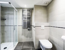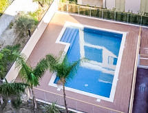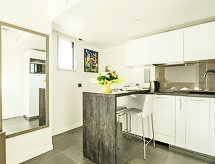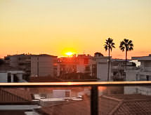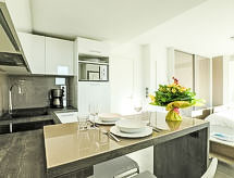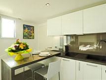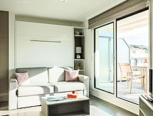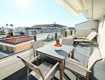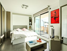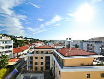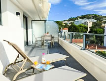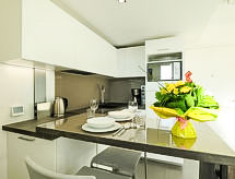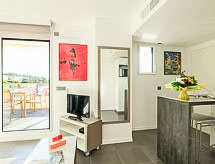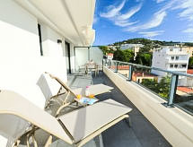 1 -sobni apartman 27 m2 na 5. katu. Moderno uređen: dnevni boravak s 1 rasklopnim franc. ormar-krevetom za 2 osobe (1 x 160 cm, dužina 200 cm), TV-om (plosnatim TV ekranom). Izlaz na terasu. Kuhinjska niša (perilica za suđe, 2 Indukcione ploče, mikrovalna pećnica, zamrzivač, el. aparat za kavu) s kutom za blagovanje. Tuš/WC. Klima uređaj, grijanje toplim zrakom. Velika terasa 18 m2. Garnitura za sjedenje, ležaljke. Na raspolaganju: perilica za rublje, glačalo, sušilo za kosu. Internet (wireless LAN [WLAN], besplatan). Garaža. Dodatna informacija: protupožarni alarm. 06029003790AK- Značajke smještaja