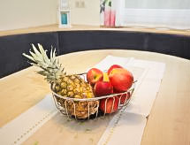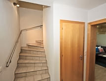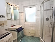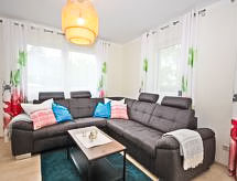 3 -sobna kuća 86 m2 na 2 etaže. Objekt pogodan za 6 + 2 djece. Svijetlo, moderno i udobno uređena: predsoblje. Dnevni boravak/blagovaona s 1 kaučem za 2 osobe, švedskom peći, stolom za blagovanje i TV-om sa sat. prijemnikom (plosnatim TV ekranom), električnim roletnama. Izlaz na terasu. Otvorena kuhinja (pećnica, perilica za suđe, 4 staklokeramičke ploče za kuhanje, mikrovalna pećnica, zamrzivač, el. aparat za kavu). Tuš/WC. Potkrovlje s kosim stropom 2 sobe, svaka soba s 1 krevetom i 1 bračnim krevetom. Kada, odv. WC. Garnitura za sjedenje, ležaljke (4), lođa, ostava. Na raspolaganju: perilica za rublje, visoka dječja stolica, dječji krevetić do 2 godine, sušilo za kosu. Internet (wireless LAN [WLAN]). Dodatna informacija: prikladno za obitelji. Kuća za nepušače. Protupožarni alarm. U slučaju boravka manjeg broja gostiju od maksimalnog kapaciteta objekta, neće biti na raspolaganju sve smještajne jedinice.- Značajke smještaja