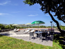 2 -sobni apartman 100 m2 na 1. katu. Prostrano, svrsishodno i komforno uređen: veliki dnevni boravak/blagovaona s panoramskim prozorom s švedskom peći i TV-om (plosnatim TV ekranom). 1 bračna soba. Kuhinja (2 ploče za kuhanje, mikrovalna pećnica, zamrzivač) s stolom za blagovanje, 1 kaučem za 2 osobe (140 cm). Tuš/bidet/WC. Grijanje na drva. Grijanje na raspolaganju samo od 01.12. do 31.03. Pogled u daljini na more. Na raspolaganju: glačalo, sušilo za kosu. Internet (wireless LAN [WLAN], besplatan). Parking (1 automobil). Dodatna informacija: apartman za nepušače.- postrojenja