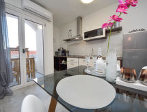 3 -sobni apartman 40 m2 na 1. katu. Dnevni boravak/blagovaona 16 m2 s TV-om sa sat. prijemnikom (plosnatim TV ekranom), klima uređajem. Izlaz na balkon. 2 sobe, svaka soba s 1 bračnim krevetom (2 x 80 cm, dužina 200 cm). Otvorena kuhinja (2 staklokeramičke ploče za kuhanje, kuhalo za vodu, mikrovalna pećnica, zamrzivač, el. aparat za kavu). Tuš/WC. Balkon 3 m2. Balkonski namještaj. Pogled u daljini na more. Na raspolaganju: Internet (wireless LAN [WLAN], besplatan).- postrojenja