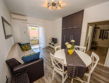 7 -sobna kuća 200 m2 na 2 etaže. Dnevni boravak/blagovaona s TV-om sa sat. prijemnikom (plosnatim TV ekranom), muzičkom linijom, DVD-om i klima uređajem. Izlaz na terasu. 1 soba s 1 franc. krevetom (160 cm, dužina 200 cm). Izlaz na terasu. 1 soba s 2 kreveta (90 cm, dužina 200 cm). Otvorena kuhinja (pećnica, perilica za suđe, 4 staklokeramičke ploče za kuhanje, zamrzivač). Tuš/WC. Gornji kat: (vanjske stepenice) dnevni boravak/blagovaona s otvorenim kaminom i TV-om sa sat. prijemnikom (plosnatim TV ekranom), muzičkom linijom, DVD-om i klima uređajem. Izlaz na terasu. 2 sobe, svaka soba s 1 franc. krevetom (180 cm, dužina 200 cm). Izlaz na balkon. 1 soba s 1 franc. krevetom (180 cm, dužina 200 cm). Otvorena kuhinja (pećnica, perilica za suđe, 4 staklokeramičke ploče za kuhanje, zamrzivač). Tuš/WC. Balkon 5 m2, terasa 20 m2 (djelomično natkrita), terasa 10 m2 (djelomično natkrita). Garnitura za sjedenje, ležaljke. Pogled na more. Na raspolaganju: perilica za rublje, visoka dječja stolica, dječji krevetić. Internet (wireless LAN [WLAN], besplatan). 1 kućni ljubimac / pas dozvoljen.- postrojenja