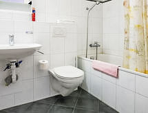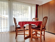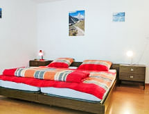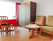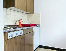 1 -sobni apartman 30 m2, u prizemlju. Jednostavno i svrsishodno uređen: dnevno-spavaća soba s 1 bračnim krevetom (2 x 90 cm, dužina 200 cm), stolom za blagovanje, kabelskom TV i radiom. Izlaz na balkon. Kuhinja (3 ploče za kuhanje, toster, kuhalo za vodu, zamrzivač, el. aparat za kavu, set za fondue (sir)). Kada/WC. Balkon 8 m2, prema istoku. Balkonski namještaj. Pogled na planine. Na raspolaganju: sušilo za kosu. Internet (wireless LAN [WLAN], besplatan). Dodatna informacija: apartman za nepušače. Najviše 1 kućni ljubimac / pas dozvoljen.- postrojenja