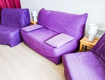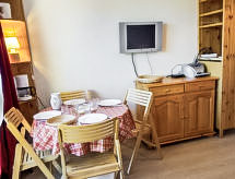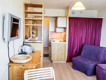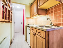 1 -sobni studio 22 m2 na 1. katu, prema sjeveru. Jednostavno i svrsishodno uređen: dnevni boravak/blagovaona, prema sjeveru s 2 kauča za 1 osobu (80 cm, dužina 190 cm), 1 kaučem za 2 osobe (140 cm, dužina 190 cm), TV-om (plosnatim TV ekranom), radiom. Kuhinjska niša u predsoblju (2 ploče za kuhanje, toster, kuhalo za vodu, mikrovalna pećnica, el. aparat za kavu, raclette roštilj). Kada/WC. El. grijanje. Parketni pod. Pogled na planine. Na raspolaganju: glačalo, sušilo za kosu. Dodatna informacija: apartman za nepušače. 1 kućni ljubimac / pas dozvoljen. Protupožarni alarm.- postrojenja