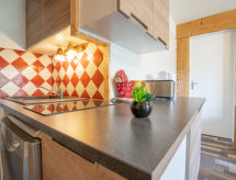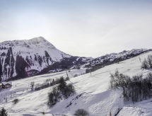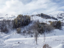 3 -sobni apartman 46 m2 na 13. katu, prema jugozapadu. Komforno i udobno uređen: dnevni boravak/blagovaona s 1 kaučem za 2 osobe (130 cm, dužina 190 cm), TV-om (plosnatim TV ekranom), DVD-om. Izlaz na balkon, prema zapadu. 1 soba s 1 franc. krevetom (160 cm, dužina 200 cm). Izlaz na balkon, prema zapadu. 1 soba s 1 kaučem za 2 osobe (140 cm, dužina 190 cm). Izlaz na balkon, prema jugu. Kuhinjska niša (pećnica, perilica za suđe, 2 staklokeramičke ploče za kuhanje, toster, kuhalo za vodu, mikrovalna pećnica, zamrzivač, el. aparat za kavu, raclette roštilj). Kada, odv. WC. El. grijanje. 2 balkona 4 m2, prema jugu i prema zapadu balkon 3 m2, prema zapadu. Lijep pogled na planine i skijašku stazu. Na raspolaganju: perilica za rublje, glačalo, sušilo za kosu. Dodatna informacija: apartman za nepušače. Protupožarni alarm.- postrojenja