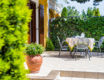 2 -sobni apartman 45 m2, u prizemlju, prema jugozapadu. Dnevni boravak/blagovaona 25 m2 s 1 kaučem za 1 osobu (140 cm, dužina 200 cm), TV-om sa sat. prijemnikom i klima uređajem. Izlaz na terasu. 1 soba s 1 bračnim krevetom (2 x 90 cm, dužina 200 cm). Otvorena kuhinja (2 ploče za kuhanje, pećnica, zamrzivač). Kada/WC. Klima uređaj (uz doplatu). Terasa 20 m2. Garnitura za sjedenje. Na raspolaganju: Internet (wireless LAN [WLAN], besplatan).- postrojenja