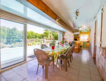 4 -sobna kuća 90 m2. Komforno i lijepo uređena: predsoblje s klima uređajem. Dnevni boravak/blagovaona s TV-om (plosnatim TV ekranom), muzičkom linijom. Izlaz na terasu. 2 sobe, svaka soba s 1 franc. krevetom (140 cm, dužina 190 cm). 1 soba s 1 kaučem za 2 osobe (160 cm, dužina 200 cm), TV-om (plosnatim TV ekranom). Kuhinja (perilica za suđe, 3 staklokeramičke ploče za kuhanje, toster, kuhalo za vodu, mikrovalna pećnica, zamrzivač, el. aparat za kavu, krušna peć). Kada, odv. WC. El. grijanje. Terasa 33 m2 (natkrita). Garnitura za sjedenje, vrtni roštilj. Pogled na bazen. Na raspolaganju: perilica za rublje, dječji krevetić. Internet (wireless LAN [WLAN], besplatan). Parking uz kuću. Dodatna informacija: prikladno za obitelji. 1 mali kućni ljubimac / pas dozvoljen. TV samo FR. Protupožarni alarm.- postrojenja