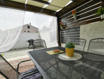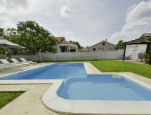 4 -sobna kuća 140 m2, prema jugu. Dnevni boravak/blagovaona 50 m2 s kabelskom TV (plosnatim TV ekranom), klima uređajem. Izlaz na terasu. 1 soba s 1 franc. krevetom (180 cm, dužina 200 cm). Izlaz na balkon. 1 soba s 1 franc. krevetom (180 cm, dužina 200 cm). 1 soba s 2 kreveta (90 cm, dužina 200 cm), TV-om (plosnatim TV ekranom). Otvorena kuhinja (4 ploče za kuhanje, pećnica, perilica za suđe, mikrovalna pećnica, zamrzivač, el. aparat za kavu). Kada/WC, tuš/WC. Balkon 4 m2, terasa 40 m2 (natkrita). Garnitura za sjedenje, vrtni roštilj (prijenosni), ležaljke. Pogled na bazen. Na raspolaganju: sušilo za kosu. Internet (wireless LAN [WLAN], besplatan).- Aktivnosti u blizini