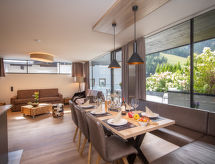"Top1", 4 -sobni apartman 98 m2. Prostrano i svijetlo, luksuzno i ukusno uređen: predsoblje. 3 bračne sobe, svaka soba s tušem/WC-om. Otvorena velika dnevno-spavaća soba s 1 kaučem za 2 osobe, stolom za blagovanje, TV-om sa sat. prijemnikom i plosnatim TV ekranom. Soba za prtljagu. Otvorena kuhinja (pećnica, perilica za suđe, 4 Indukcione ploče, toster, kuhalo za vodu, mikrovalna pećnica, zamrzivač, el. aparat za kavu). Tuš/WC. Podno grijanje. Velika terasa 57 m2. Garnitura za sjedenje. Vrlo lijep panoramski pogled na planine i krajolik. Na raspolaganju: sušilo za kosu. Internet (wireless LAN [WLAN], besplatan). Parking (natkrit). Dodatna informacija: apartman za nepušače. Protupožarni alarm, vatrogasni aparat. Rezervira se tipski objekt (kuća, apartman) i moguća su manja odstupanja. 50628-001295-2020- postrojenja