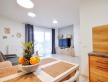 Moderni, komforni stambeni objekt "Szum Morza", godina izgradnje 2017. Na rubu mjesta, mirno, sunčano mjesto, 350 m od mora, u zelenom. Za zajedničko korištenje: unutarnji bazen grijani (6 x 17 m, bazen je otvoren u vremenu: 09:00-21:00). Tuš/WC uz bazen, bazen za djecu, hidromasažni bazen, dječje igralište. U kući: sauna, prostorija za fitnes, igraonica za djecu, dizalo, centralno grijanje, alarmni sustav. Parking uz kuću na parceli, javni parking na ulici. Trgovina 1.3 km, trgovina živežnim namirnicama, supermarket 850 m, restoran 300 m, autobusna postaja 1.1 km, željeznička postaja 2.5 km, pješčana plaža 350 m. Sportska lučica 3 km. U blizini: Oceanarium 3 km, Molo 3 km, Park Dziki Zachód Zieleniewo 7 km. Residence pod nadzorom.Interior