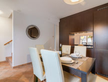 "Tasman 15/R", 3 -sobni apartman 117 m2 na 2 etaže. Prostrano, komforno i ukusno uređen: dnevni boravak/blagovaona s kutom za blagovanje i TV-om. Izlaz na terasu. Otvorena kuhinja (perilica za suđe, 4 staklokeramičke ploče za kuhanje, toster, kuhalo za vodu, mikrovalna pećnica, zamrzivač, el. aparat za kavu, Doze za mašinu za kavu (Nespresso) uz doplatu). Odv. WC. Gornji kat: 1 soba s 1 bračnim krevetom (150 cm, dužina 200 cm). 1 soba s 3 kreveta (90 cm, dužina 190 cm). Kada/WC. Terasa. Balkonski namještaj. Vrlo lijep pogled na planine, krajolik i kanal. Na raspolaganju: perilica za rublje, sušilica. Internet (wireless LAN [WLAN], besplatan). Parking br. 127. Dodatna informacija: apartman za nepušače.- postrojenja