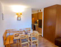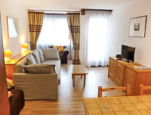 1 -sobni apartman 41 m2 na 2. katu. Dnevni boravak/blagovaona s 1 kaučem za 2 osobe (140 cm, dužina 200 cm), kabelskom TV i plosnatim TV ekranom. Mala niša za spavanje s 1 x 2 kreveta na kat. Kuhinjska niša (4 ploče za kuhanje, pećnica, perilica za suđe, toster, kuhalo za vodu, el. aparat za kavu, set za fondue (sir)). Kada/WC. Terasa 13 m2, prema jugozapadu. Garnitura za sjedenje, ležaljke (1). Lijep pogled na planine. Na raspolaganju: glačalo, sušilo za kosu. Garaža br. 90, visina 200 cm, širina 220 cm. Dodatna informacija: apartman za nepušače.- postrojenja