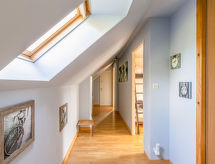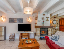 "Ti Bonheur", 3 -sobna kuća 70 m2. Komforno i lijepo uređena: dnevni boravak/blagovaona s TV-om, plosnatim TV ekranom, muzičkom linijom i peći na drva. Izlaz na terasu. Otvorena kuhinja (pećnica, perilica za suđe, 5 plamena za kuhanje, toster, kuhalo za vodu, mikrovalna pećnica, zamrzivač, el. aparat za kavu). El. grijanje. Gornji kat: 1 soba s 1 x 2 kreveta na kat (140 cm, dužina 190 cm). 1 soba s 1 franc. krevetom (140 cm, dužina 190 cm). Odv. WC. Garnitura za sjedenje, vrtni roštilj (prijenosni), mjesto za sjedenje. Na raspolaganju: perilica za rublje, sušilica, glačalo. Dodatna informacija: kuća za nepušače. 2 kućna ljubimca / psa dozvoljena. Protupožarni alarm.- Značajke smještaja