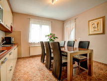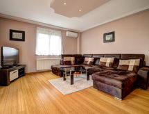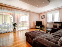 3 -sobni apartman 130 m2, u povišenom prizemlju. Lijepo i ukusno uređen: dnevni boravak s TV-om sa sat. prijemnikom (plosnatim TV ekranom), klima uređajem. Izlaz na terasu. 2 sobe, svaka soba s 1 bračnim krevetom (2 x 90 cm, dužina 200 cm). Izlaz na terasu. Blagovaona. Izlaz na terasu. Otvorena kuhinja (pećnica, perilica za suđe, 4 staklokeramičke ploče za kuhanje, mikrovalna pećnica, zamrzivač, el. aparat za kavu). Odv. WC, kada/tuš/bidet/WC, duplim umivaonikom, hidromasažnom kadom. Grijanje (uz doplatu). Terasa 25 m2 (natkrita), terasa 16 m2 (natkrita). Garnitura za sjedenje. Djelomičan pogled u daljini na more. Na raspolaganju: Internet (wireless LAN [WLAN], besplatan). Dodatna informacija: vatrogasni aparat.- Aktivnosti u blizini