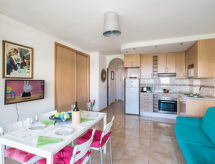 3 -sobni apartman 65 m2 na 2. katu. Objekt pogodan za 2 odraslih + 2 djece. Jednostavno i komforno uređen: dnevni boravak/blagovaona s digitalnim TV, plosnatim TV ekranom, klima uređajem i grijanjem na topli zrak. Izlaz na terasu. 1 bračna soba s 2 kreveta (90 cm). 1 bračna soba s 1 krevetom (150 cm). Otvorena kuhinja (pećnica, mikrovalna pećnica, el. aparat za kavu). Tuš/WC. Terasa. Garnitura za sjedenje. Pogled na bazen, vrt i more. Na raspolaganju: perilica za rublje. Prikladno za obitelji. VFT/MA/35731- postrojenja
