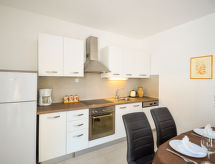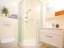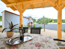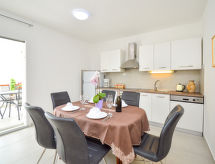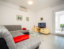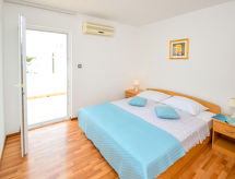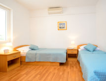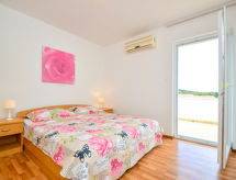 4 -sobna polovica dvojne kuće 120 m2 na 2 etaže. Dnevni boravak/blagovaona 30 m2 s 1 kaučem za 2 osobe (150 cm, dužina 200 cm), TV-om sa sat. prijemnikom (plosnatim TV ekranom). Izlaz na terasu. 1 soba s 2 kreveta (90 cm, dužina 200 cm), klima uređajem. Otvorena kuhinja (pećnica, perilica za suđe, 4 staklokeramičke ploče za kuhanje, kuhalo za vodu, zamrzivač, el. aparat za kavu). Tuš/WC. Gornji kat: 2 sobe, svaka soba s 1 bračnim krevetom (2 x 90 cm, dužina 200 cm), tušem/WC-om i klima uređajem. Izlaz na terasu. Klima uređaj (uz doplatu). Terasa 22 m2 (natkrita), terasa 22 m2. Garnitura za sjedenje, ležaljke (2). Na raspolaganju: glačalo. Internet (wireless LAN [WLAN], besplatan).- postrojenja