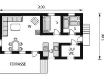 "Trygvebu (SOW057)", 3 -sobna kuća 40 m2. Udobno i s puno drva uređena: dnevni boravak/blagovaona s švedskom peći i stolom za blagovanje. Izlaz na terasu. 1 soba s 1 x 1 kreveta na kat (80 cm, dužina 200 cm), 1 bračnim krevetom (160 cm, dužina 200 cm). 1 soba s 1 x 2 kreveta na kat (80 cm, dužina 200 cm). Otvorena kuhinja (4 ploče za kuhanje, pećnica, toster, kuhalo za vodu, mikrovalna pećnica, el. aparat za kavu). Tuš/WC. El. grijanje. Drveni pod. Mala terasa 10 m2 (djelomično natkrita). Garnitura za sjedenje, vrtni roštilj (prijenosni). Na raspolaganju: drvo (uz doplatu). Dodatna informacija: hladnjak bez zamrzivača kuća za nepušače. Najviše 2 kućna ljubimca / psa dozvoljena. Protupožarni alarm, vatrogasni aparat. 924531169- postrojenja